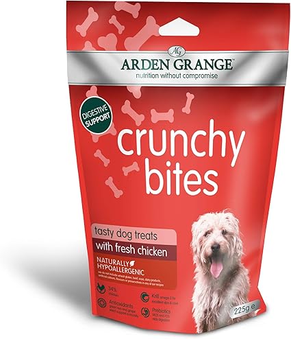 Arden Grange Crunchy Bites with fresh chicken are tasty, nutritious treats perfect as a reward during training or simply to show your dog some love. Made with 25% chicken meal and 9% fresh chicken, these crunchy bites are both satisfying and full of natural flavour.