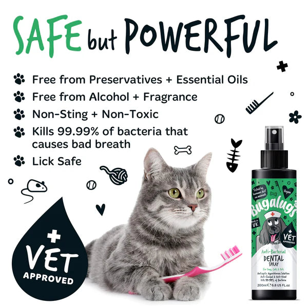 Bugalugs Antibacterial Dental Spray is a clinically proven oral care solution formulated with hypochlorous acid – a natural disinfectant produced by your pet’s own immune system. This gentle yet powerful spray helps to eliminate 99.99% of bacteria that cause bad breath, promoting fresher breath and improved oral hygiene.