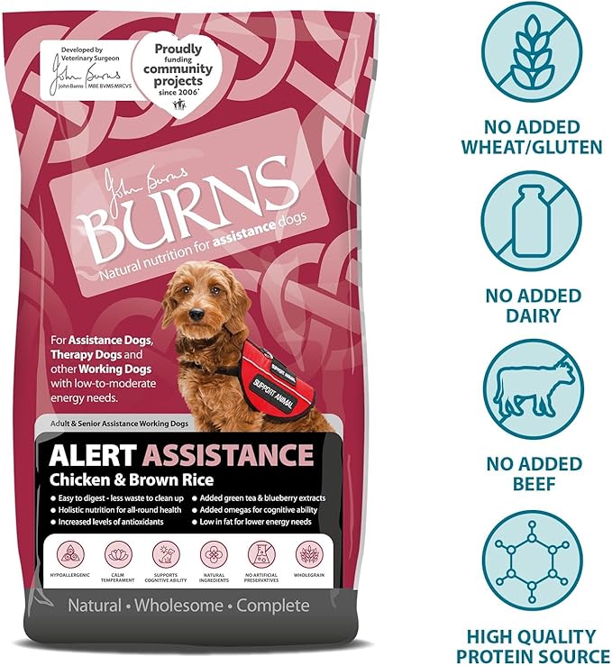 Burns Alert Working Dog Food is specially developed for dogs that need to stay calm, focused, and alert — ideal for assistance and working roles. Enriched with salmon oil and high levels of antioxidants, this hypoallergenic, complete dry food supports healthy digestion, a shiny coat, and long-term vitality.