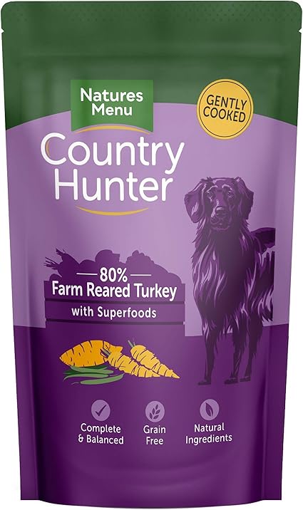 Give your dog a meal they’ll love with Country Hunter Turkey Pouches, crafted with 80% farm-reared turkey and enriched with a blend of wholesome fruits, vegetables, and superfoods. Each pouch is gently steam-cooked to lock in natural nutrients and irresistible flavour, ensuring a delicious and healthy dining experience for your furry friend.