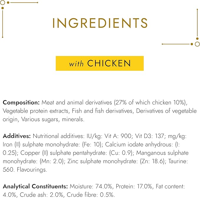 Meat and animal derivatives (including 4% Chicken), Vegetable protein extracts, Fish and fish derivatives, Minerals, Various sugars.
