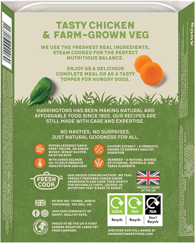 Treat your dog to a natural, grain-free diet with Harringtons Chicken with Potato & Vegetables – a complete wet dog food made with wholesome, 100% natural ingredients. This tasty tray-cooked recipe features 65% chicken, including 26% freshly prepared meat, combined with nutrient-rich vegetables like potatoes, peas, and carrots.
