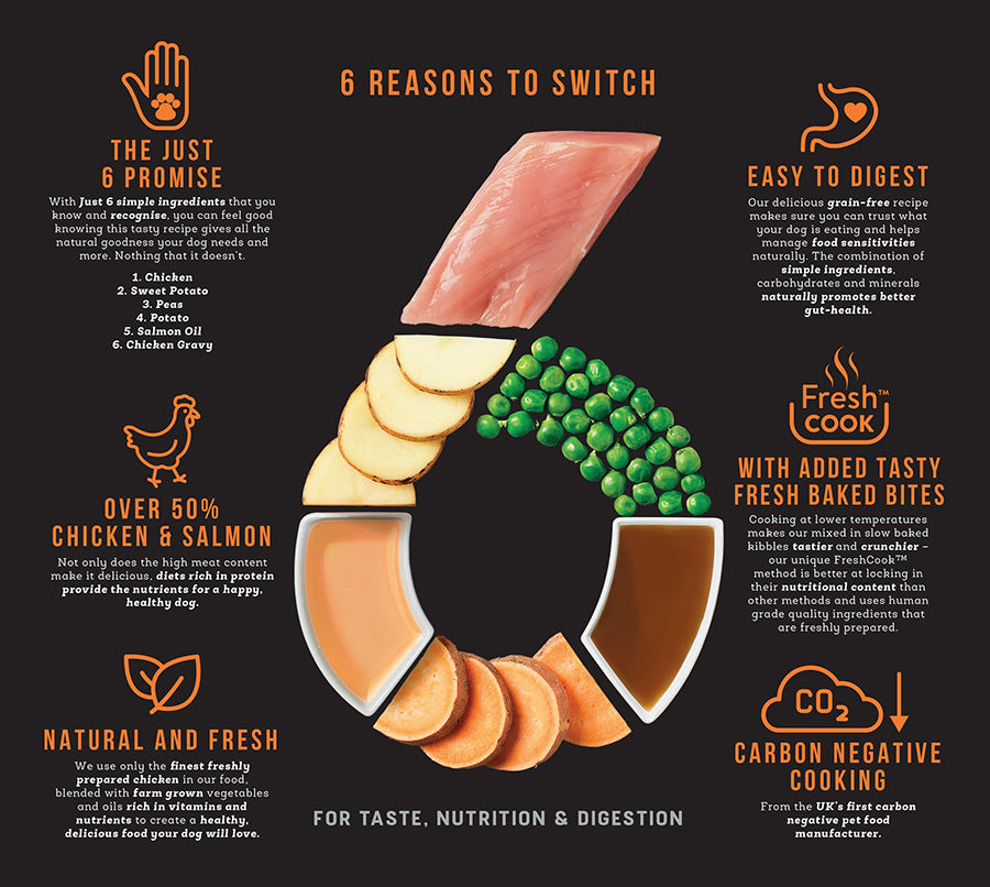 Harringtons Just 6 is a complete, grain-free dry dog food made with only six carefully selected, high-quality ingredients—each chosen for taste, nutrition, and easy digestion. With over 50% chicken and salmon, it’s a protein-rich recipe your dog will enjoy in every bite.