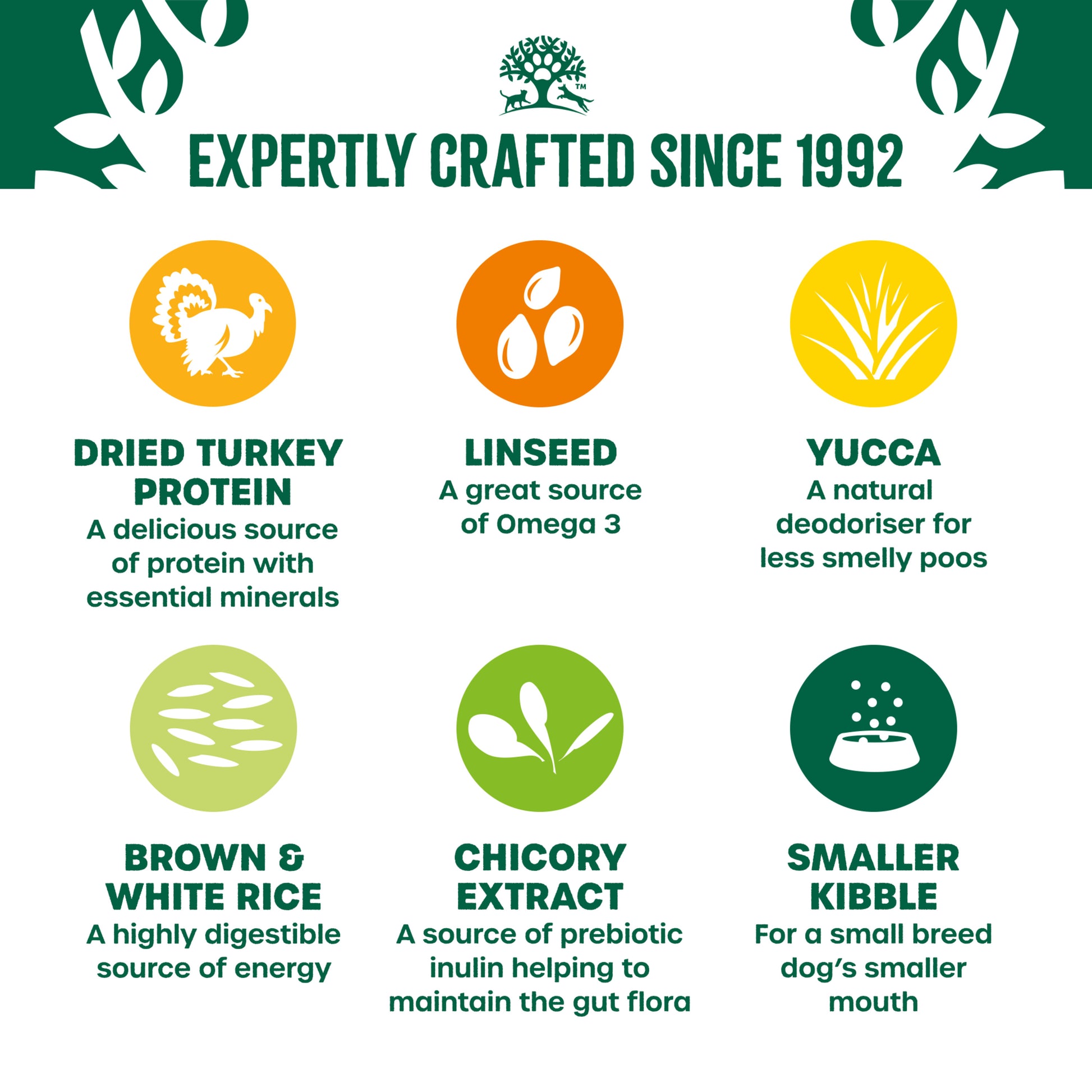 Carefully crafted with nature’s finest ingredients, this delicious turkey recipe offers a highly digestible and nutritious dry dog food tailored for small breed dogs. Each bite-sized kibble is designed to fit smaller mouths and is packed with essential nutrients to support digestion, a strong immune system, and a healthy skin and coat.