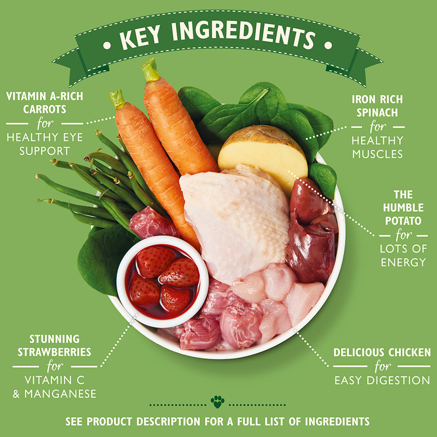 Now, let’s talk about this party in a tin. Your dog will be thrilled with this grain-free, nutritionally complete recipe made with succulent fresh chicken, sweet strawberries, and garden vegetables. Packed into six generous 400g portions, it’s the perfect springtime feast for your four-legged friend—delicious, wholesome, and made with love.