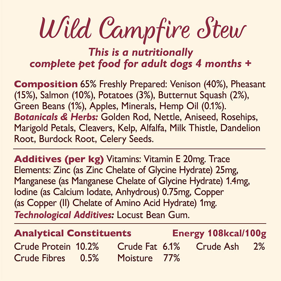 Looking for a delicious, protein-rich alternative for your dog? This irresistible, grain-free wet food is made with freshly prepared venison, pheasant, and salmon—perfect for dogs with sensitivities to traditional meats. Each complete meal is bursting with wholesome vegetables like potatoes (a natural source of potassium) and butternut squash (rich in vitamins A and C), plus Lily’s unique blend of healthy herbs. Steam-cooked to lock in flavour and nutrients, it’s a nourishing dish that’s easy to digest and free from meat meals, fillers, or artificial additives.
