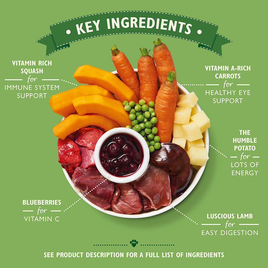 Want to level up your dog parenting game? Start with dinner. This nourishing wet food is made with freshly prepared lamb, potatoes, and a vibrant mix of vegetables and fruits like squash, broccoli, and blueberries. It's a complete, balanced recipe packed with natural goodness, added vitamins, minerals, and a unique blend of herbs to support your dog’s overall health. Steam-cooked to lock in nutrients and easy on sensitive tummies, this meal is as wholesome as it is delicious.