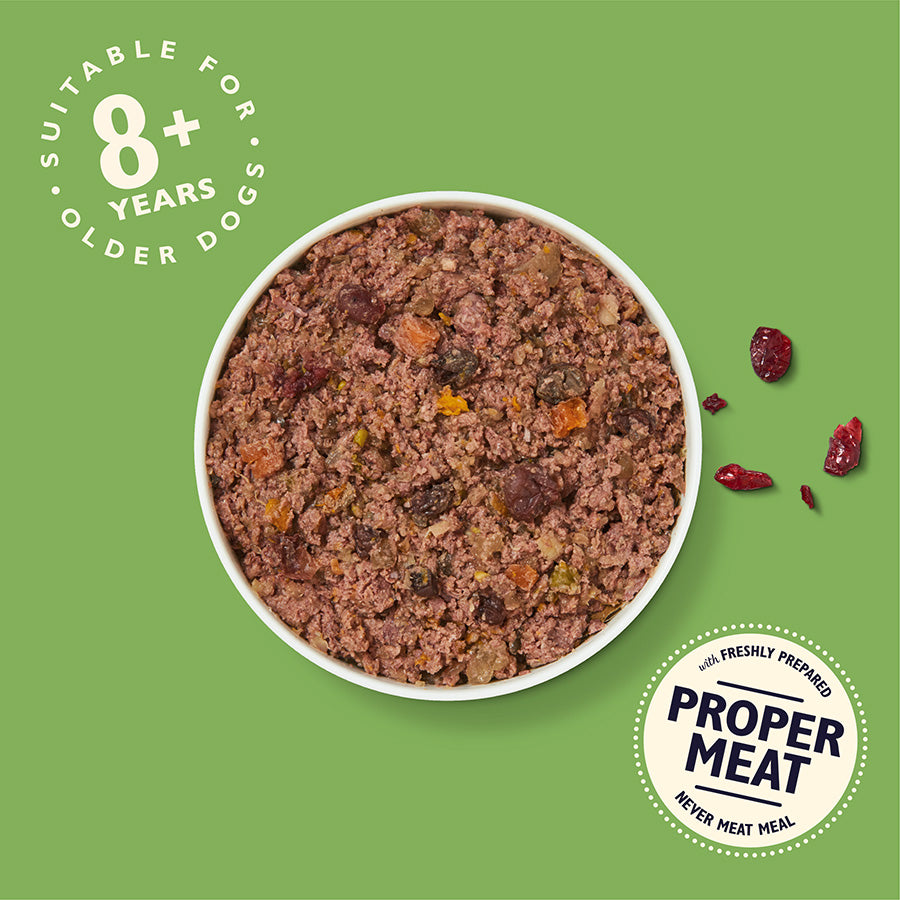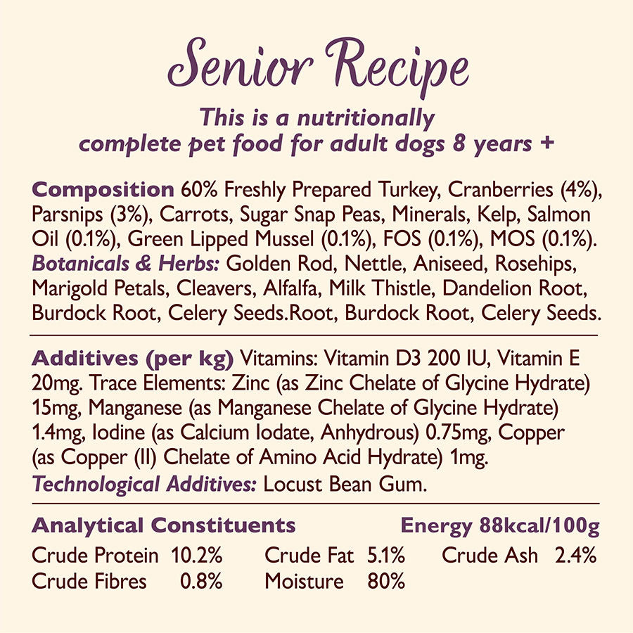 As dogs grow older, their needs change—so Lily’s Kitchen has crafted this special grain-free Senior Recipe to help your dog stay happy, healthy, and active in their golden years. Made with fresh turkey, nourishing fruit and veg, and a carefully selected blend of botanical herbs, this hand-crafted meal is gentle on sensitive stomachs and packed with natural goodness.