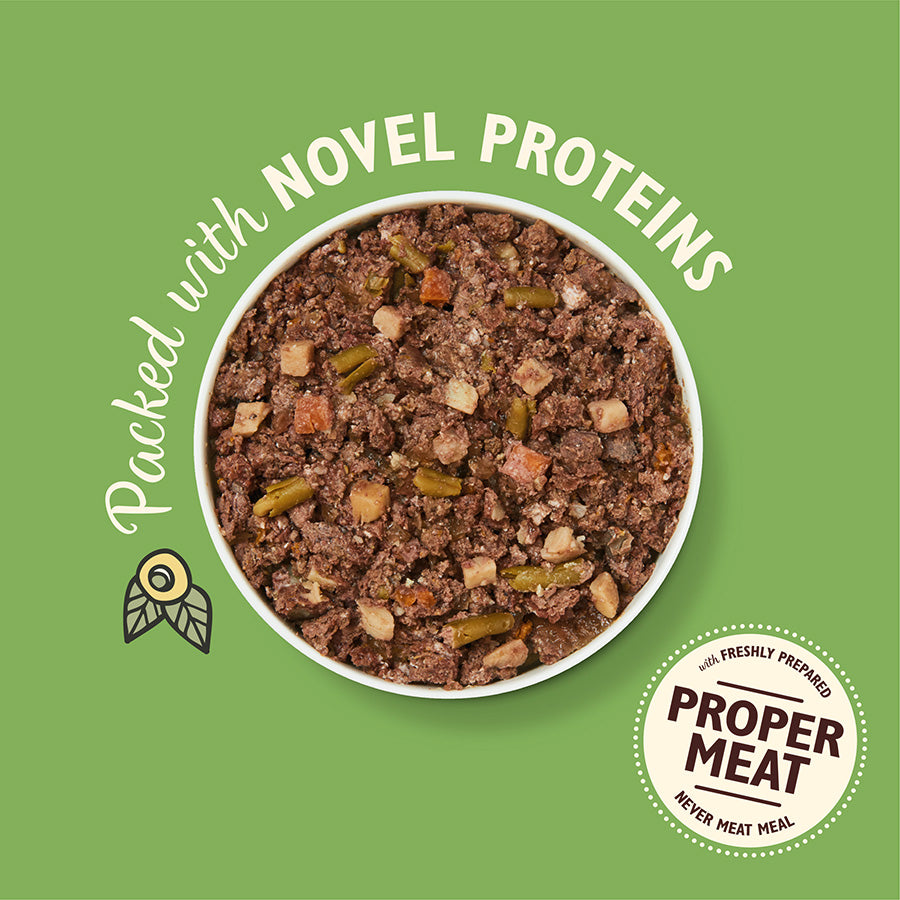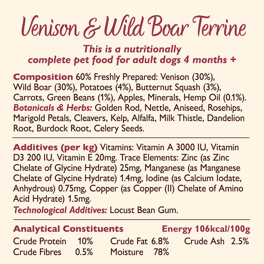 This grain-free, hypoallergenic wet dog food is a complete and nourishing recipe made with freshly prepared venison and wild boar—ideal for dogs with sensitivities or those who enjoy something a little different. Packed with wholesome vegetables and fruits like potato, butternut squash, carrots, green beans, and apples, it’s bursting with natural goodness.