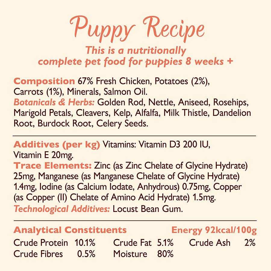No meat meals, rendered meat, or artificial nasties—just real food made with care. This gentle, balanced recipe is steam-cooked to preserve goodness and crafted to help your pup thrive from the very first bite.