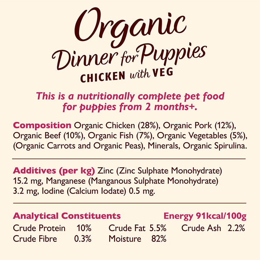 Welcoming a playful new pup? Give them the best start with this organic, complete puppy food made from freshly prepared chicken, pork, beef, and fish. Packed with natural ingredients and enriched with essential vitamins and minerals, it’s specially formulated to support growing pups up to 8–14 months. Gently steam-cooked for maximum nutrition, with no fillers, meat meal, or artificial additives—just honest, wholesome food for your lucky little companion.