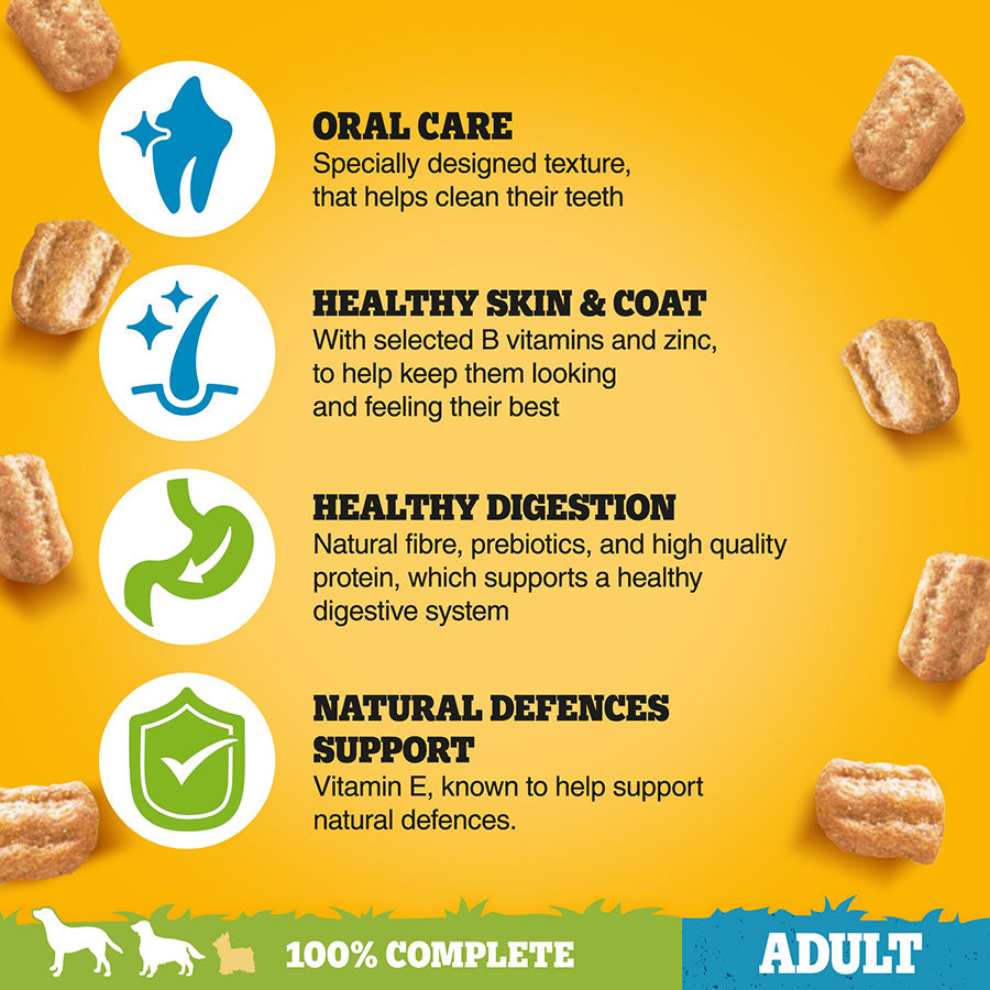 Crunchy kibble with a specially designed texture to help clean teeth and promote oral hygiene.