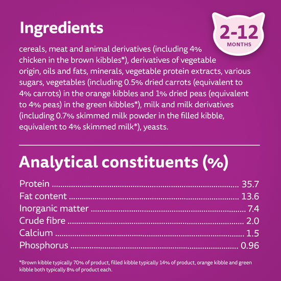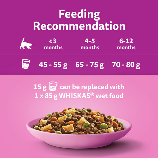 Support your kitten’s early development with Whiskas Kitten Dry Food. Made with real chicken and a thoughtfully balanced mix of nutrients, it’s specially designed for kittens aged 2 to 12 months. Every bite is easy to digest and tailored to help your little one grow strong and healthy.